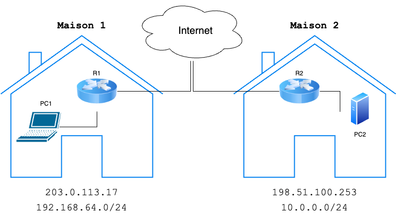 Deux domiciles Maison 1 et Maison 2 sont connectés à Internet à l'aide d'un routeur. Le service NAT est activé dans ces routeurs afin de permettre la connectivité Internet à partir du réseau privé du domicile correspondant.